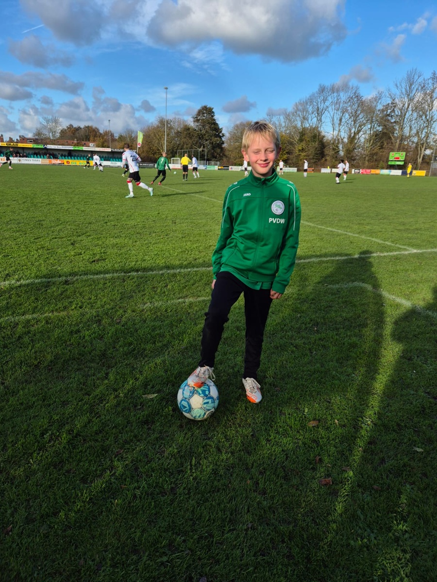 Cas is trouwens ook goudeerlijk. Traditioneel moest de pupil voor de wedstrijd de aftrap nemen en proberen om de vijandelijke doelman te passeren. Helaas schoot Cas naast omdat hij zich – volgens eigen zeggen - wat verkeken had op het gewicht van de bal. “Voor 20 euro schrijf ik in het verslag dat je wel een doelpunt scoorde in de rechterbovenhoek” zei iemand die niet genoemd wil worden maar wel deze stukjes schrijft. “Nee hoor, dat hoeft echt niet” was het antwoord van Cas. Kijk en dan ben je een voorbeeld voor andere kinderen! Cas was op zondag 9 november, toen hij pupil was, ook jarig en hij was11 jaar oud geworden. Op je verjaardag gewoon aanwezig zijn op het voetbalveld. Klasse!