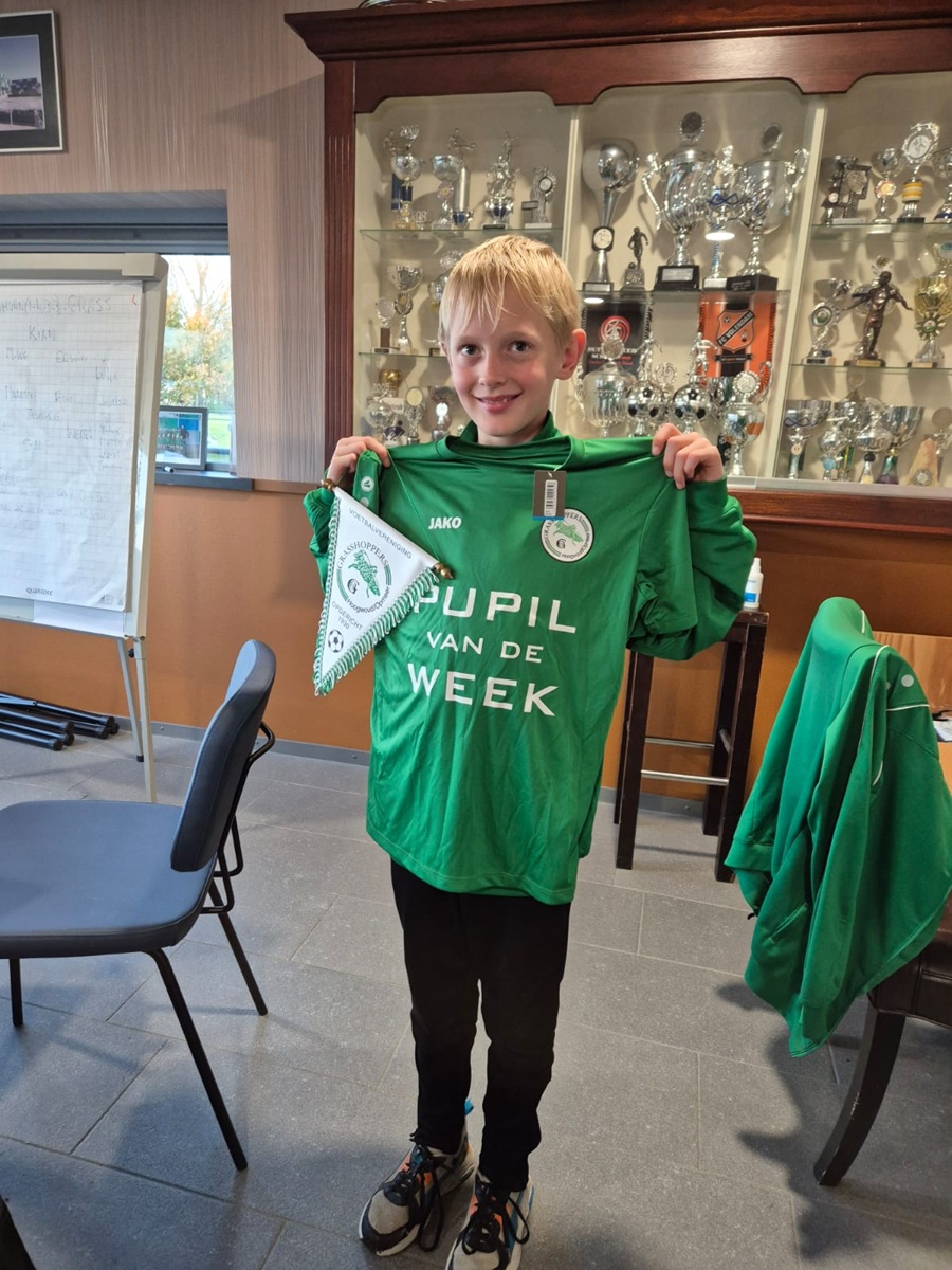 Cas vond het erg leuk om pupil van de week te zijn ook omdat hij mee mocht in de kleedkamer en de bestuurskamer. Als laatste weet hij nog een mop: